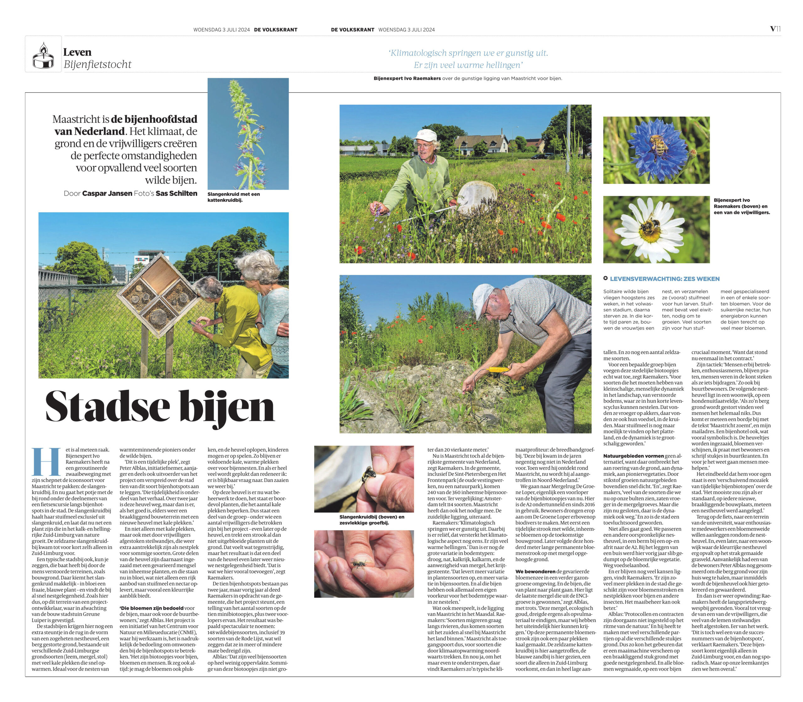 Volkskrantjournalist Caspar Janssen fietste mee met een excursie langs een aantal bijenhotspots, en kreeg onder andere de slangenkruidbij onder ogen. Hier zijn verhaal. Over bloemen en bijen, vrijwilligers en die o-zo-belangrijke leemsteilwandjes.